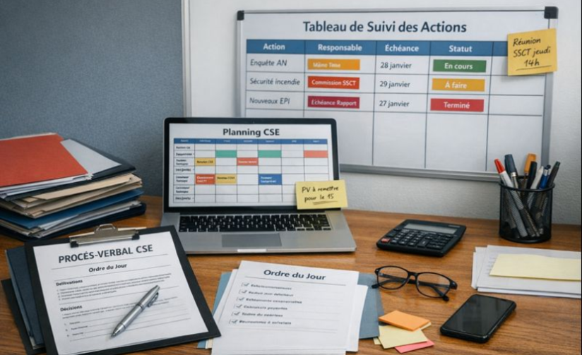 Dans une entreprise de 300 salariés ou plus, le calendrier annuel (réunions mensuelles, commissions, jalons) est l’outil n°1 et il est complété par un rétroplanning de production du PV (rédaction, relecture, transmission). Piloter les heures de délégation comme une ressource rare permet de réserver du temps à la préparation, à la relecture du PV, à la négociation et au suivi des décisions.